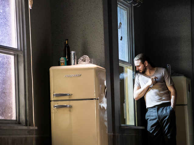 Handlungen, Rückerinnerungen, Albträume finden in einem gespenstischen Ambiente statt. Das Bühnenbild von Etienne Plus zeigt den Einheitsraum eines zunächst schmalen Zimmers mit minimalen Ausstattungsmerkmalen wie Kühlschrank, Stuhl und am Boden liegender Matratze im Nirgendwo. Etwa wie in einer kleinen, ärmlichen Wohnung, einem Hotel oder einer psychiatrischen Anstalt. Einige wenige Ausstattungsmerkmale deuten regional auf die USA hin, könnten letztendlich ebenso in Russland oder anderswo lokalisiert sein.