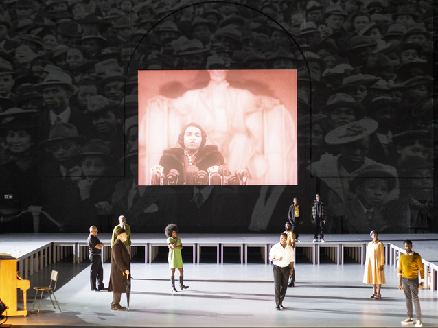 Der Regisseur Ted Huffman und sein Team greifen die Zweiteilung auf und steigern den Eindruck noch durch die strenge und karge Ausstattung von Bühne (Johannes Schütz) und Kostüm (Astrid Klein), vor allem aber durch die Einbringung von Dokumentarvideos (Pierre Martin), u.a. vom Konzert Andersons in Washington oder den Original-Fernsehberichten zu den Rassenunruhen 1965 und 1992, die im Originalton eingeblendet werden. Auf der Bühne stehen ansonsten nur ein Scheinwerfer und ein Klavier. Sie ist an den Außenrändern umgeben von einer Reihe von Tischen, die in verschiedenen Szenen von den Sängern rasch selbst szenisch arrangiert werden.