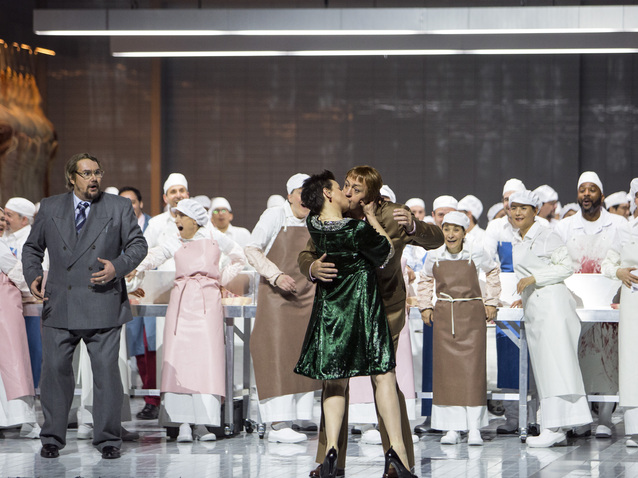 Die Spannung und Aufdringlichkeit von Musik und Geschichte war sicherlich auch die Absicht des Komponisten, der sich zeitlebens sehr schwer mit seinem eigenen Anspruch an seine Aufgabe tat. Mit seiner Darstellung des Klassenkampfes setzt er gesellschaftspolitische Aussagen, in der Darstellung des inneren Seelenlebens seiner Charaktere zeichnet er psychologische Diagramme und Kämpfe bis zum Zerreissen. Beides sind unerschöpfliche Quellen für eine realitätsbezogene und emotional aufgeheizte musikalische Aufarbeitung. Die Oper Lady Macbeth traf den Nerv der Zeit und war deshalb auch bei seiner Uraufführung und danach sehr erfolgreich bis der Diktator Stalin sich das Werk höchst persönlich anhörte und schaute. Der Rest ist bekannt. Das Werk wurde von den politischen Stellen verurteilt und verpönt, der Komponist zog sich schwer getroffen und verunsichert in die innere Isolation zurück. Auch der Regisseur Krzysztof Warlikowski trägt den Ruf eines Spezialisten für die Darstellung expressiver Frauenrollen und gesellschaftskritischen Werken. Insbesondere aber auch als Erneuerer des Theater in Sinne Shakespeares. Eine kräftige Bildsprache und ausgefeilte Personenführung geht mit diesem Ruf einher. Die Bühnen- und Kostümbildnerin Malgozata Szczesniak arbeitet und unterstützt ihn mit ihren subtilen kreativen Schöpfungen, die vordergründig ästhetisch schwer lastende Anklagen verpacken. So lassen die Beiden die Handlung in einem Schlachthof spielen. Hell ausgeleuchtet, steril weiss gefliesst sind die Bühnenwände, ein beweglicher transparenter Container in der Mitte zeigt die persönlichen Räume von Katerina Ismailova in vollkommen ungeschützter Privatsphäre. Ein Abbild der gesellschaftlichen Rolle der Frau, dem Willen und der Begierden des Mannes schutzlos ausgeliefert. Zu Beginn werden ein paar frisch geschlachtete Schweinhälften aufgehängt zur weiteren Verarbeitung hereingefahren. Der Chor in weissen Mänteln und Haube macht sich adrett an die Arbeit. Alles wirkt sauber und wohlgeordnet aber der Zerfall fängt leise an zu brökeln und das Chaos entwickelt sich unaufhaltsam ebenso wohlgeordnet. Dabei spielen die Lichtregie von Felice Ross wir auch die Videos von Debis Guégin eine wichtige Rolle. Im blutroten Kleid und Anzug wird geheiratet, die Bluttat bleibt aufdringlich präsent, auch wenn noch ausschweifend gefeiert wird lastet sie über Serguei und Katerina. Weniger überzeugend wirkt die Umsetzung im letzten Bild. Statisch aufgereiht dunkel eingehüllt die Athmosphäre des Zuges der Sträflinge. Die Sinnhaftigkeit des omnipräsenten Containers in der Bildmitte hierbei nicht klar erkennbar. Die finale Verzweiflungstat entzieht sich dem Betrachter, erst die Wiederholung der einleitenden Videos und die auflösende Musik führen zur Handlung zurück und berühren.