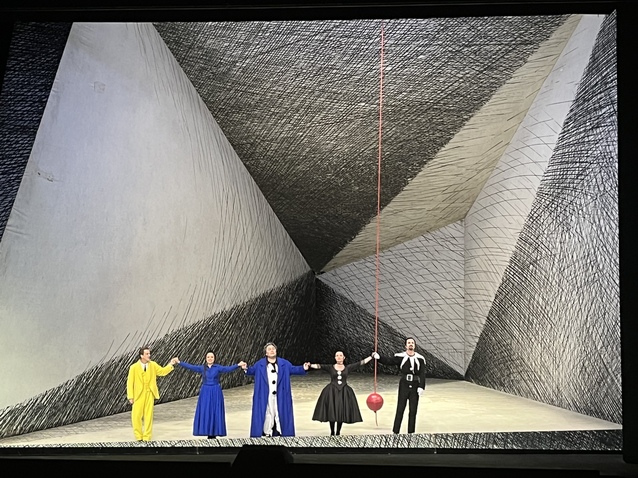 1994 feierte die Inszenierung des Melodrammas Rigoletto von Giuseppe Verdi durch Andreas Homoki Premiere an der Staatsoper Hamburg. Auch nach 30 Jahren hat das Bühnenbild und die Kostüme von Wolfgang Gussmann nicht an Expressivität verloren. Angelehnt an das Genre Zeichentrickfilm verengt er die Bühne spitz nach hinten zulaufend, wobei die Wände mit einem geometrischen Muster symmetrisch schwarz weiß gehalten sind. Ein große goldene Krone als Liebesversteck des Herzogs und eine dunkelblau fensterlose Hütte sowie ein rotes Pendel als Symbol des Schicksals sind die einzigen Requisiten. Rigoletto ist Pierrot oder Bajazzo aus der Comedia dell‘Arte, die Höflinge sind wie die Biene Maja gelb schwarz gehalten mit venezianischen roten Masken ständig tölpelhaft aber emsig in Bewegung. Der Herzog im gelben Anzug, Gilda im blauen Kleid. Farben spielen eine kräftige symbolische Rolle. Hütte und Krone werden immer wieder bewegt, kurz gesellt sich eine überdimensionale gelbe Leiter hinzu. Szenenwechsel leitet der Hofnarr Rigoletto selbst ein, in dem er einen wiederum schwarz weißen Bühnenvorhang von oben herunterzieht. Insgesamt wirkt diese Interpretation leblos und ohne Schwung in der Aneinanderreihung der Bilder.