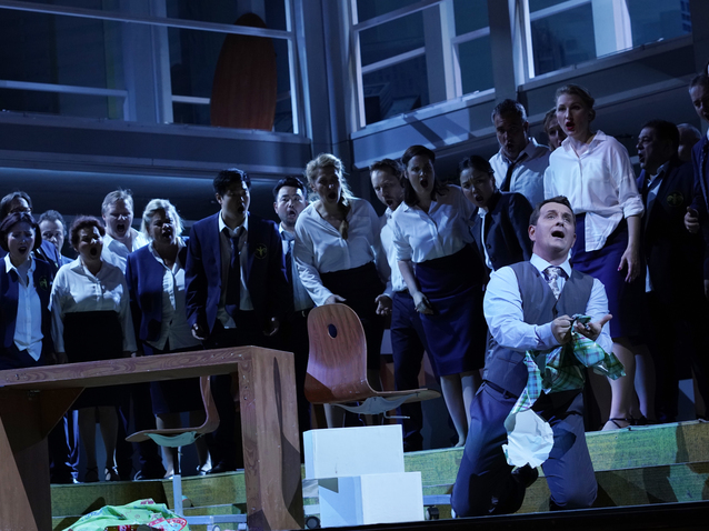 Ins Heute hat er das Seelendrama nach Euripides - eine Koproduktion mit der Opéra de Nice und dem Theater in Erfurt- nach New York verlegt, in die obersten Etagen eines Hochhauses, eine Art Trump-Tower, wo seinerzeit Jason und Medea ein multinationales Finanzunternehmen gegründet haben. Eine nicht unbedingt neue aber vertretbare Konzeption. Man sieht ein mit Laptops ausgestattetes Großraumbüro und hinter den Glasfronten weitere Wolkenkratzer (Ausstattung: Annemarie Woods). Der exzellent singende Chor des Hauses fungiert als uniformierte Büroangestellte. Der Regisseur will die Zeitlosigkeit des Themas zeigen und die psychische Verfassung der Protagonisten offenlegen, die eindrucksvoll spürbar wird und er hat viele Ideen. So erhält Dircé, die erste Frau Jasons von diesem einen goldenen Widderkopf, symbolhaft für das goldenen Vlies. Und sie wird anders als in der Vorlage durch ein fatales Hochzeitsgeschenk von Medea, dem symbolträchtigen, roten Schal dem seinerzeitigen Zeichen ihrer Liebe zu Jason und einer Pistole in den Selbstmord gedrängt.