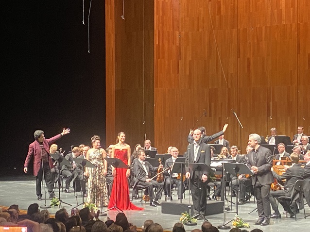 Und so war ein Sopranistinnen-Streit vorprogrammiert, als Kathryn Lewek als Madame Herz und Serena Sáenz als Mademoiselle Silberklang alle Register ihres Könnens zogen und ihre sauberen Koloraturen in alle nur möglichen Höhen hinausschleuderten. Und dann tauchte plötzlich noch Rolando Villazón als im Programm nicht angekündigter Überraschungsgast auf und versuchte die beiden händeringend mit „Piano! Pianissimo!“ zu beschwichtigen. Für eine Aufführung des „Schauspieldirektors“ hatte Mozart Sohn Franz Xaver eine Einlagearie komponiert: „Ich bin der erste Buffo“: Theodore Platt war dieser Buffo, der dann bei der Salieri Oper als Poeta gegen den profunden Nahuel Di Pierro als Maestro ins Feld zog. Da sprudelte der Witz nur so mit wunderbaren, vitalen Gesängen. Auch hier zeigten sich die Philharmoniker unter dem hier moderierenden Dirigenten von der besten Seite. Jubelnder Applaus!