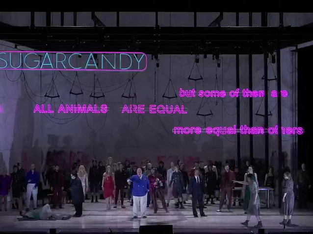 „All animals are equal - but some of them are more equal than others”: prangt in riesigen, pinkfarbigen Neonlettern zum Finale auf der Bühne. Es ist das berühmt gewordene Zitat aus George Orwells Tierparabel „Animal Farm“, ein Klassiker aus 1945, das dieser als Satire über den damaligen Sowjetkommunismus und Stalin verstanden wissen wollte. Es handelt von der Genese einer mörderischen Diktatur, von Schweinen, die die Macht auf einem vernachlässigten Bauernhof eines brutalen Besitzers übernehmen aber dann selbst zu Unterdrückern der anderen Tiere werden. Es geht um Inbesitznahme von Privilegien, um Machterhalt und um Tyrannisierung anderer. Auch jetzt nahezu 80 Jahre später erscheint der Roman nach wie vor topaktuell. Der aus Russland stammende, in Deutschland lebende Komponist Alexander Raskatov hat als koproduziertes Auftragswerk nach dem Libretto von Ian Burton daraus eine Oper geschaffen, die nach der Uraufführung im Mai 2023 in Amsterdam nun an der Wiener Staatsoper Premiere hatte.