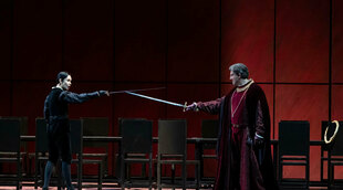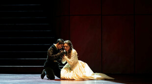 La reprise de cette production des Capulet et Montaigu de Bellini, signée Robert Carsen (créée à l’Opéra de Genève sous le directorat d’Hugues Gall il y a… trente-deux ans !) montre combien un spectacle pensé et réalisé avec intelligence et goût passe les années sans pâlir. Nombre de ceux qui découvrent cette production des Capulet à cette occasion se disent frappés par son intemporalité, comme si elle était déjà devenue un classique. Il est vrai que la conception de Robert Carsen, cette binarité du rouge des Capulet et du noir des Montaigu, dans un décor grandiose de Michael Levine, fait de panneaux mobiles, d’escaliers abrupts et de perspectives sans fin, rehaussé par des costumes splendides, contribue à la fois à la picturalité caravagesque du spectacle et à son resserrement tragique. Le sang et l’ombre se nouent sur cette scène sculptée par les éclairages de Davy Cunningham : une violence sourde, permanente, oppressante plane sur la représentation.