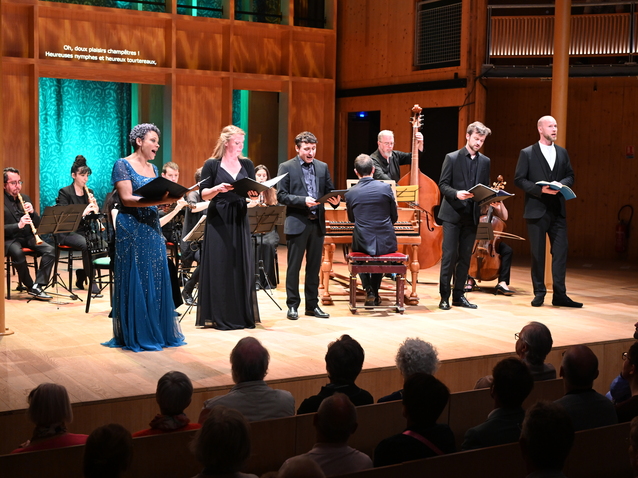 C’est à l’Ensemble Masques que le festival a fait appel pour rendre compte de la beauté de la partition de Haendel. Si l’homogénéité et l’unité de l’ensemble n’étaient pas tout à fait parfaites – avec par exemple un violon se hissant pour quelques notes au-dessus de l’ensemble – le rendu n’en demeurait pas moins très beau sous la direction d’Olivier Fortin, également au clavecin. Les couleurs demeurent présentes, et les musiciens hissent haut la musique de Haendel. Celle-ci s’avère particulièrement expressive et se plait à glisser d’un instrument à l’autre pour former un tout qui n’a finalement pas besoin de mise en scène pour amener à nos esprits les images de ce semi-opéra. L’entracte proposé n’était peut-être pas nécessaire, mais le changement de ton avec l’arrivée du cyclope au deuxième acte s’y prête toutefois.