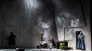 Parlons tout d’abord des défauts du spectacle. La mise en scène de Célie Pauthe s’appuie sur de très belles lumières et une magnifique direction d’acteurs, au diapason d’une équipe de chanteurs profondément investis (nous les citerons tous plus tard). Mais la scénographie n’échappe pas à une certaine littéralité, voire à une forme d’imagerie chrétienne, qui frôle le saint-sulpicianisme dans les scènes finales. L’autre écueil de la soirée consiste dans le relatif statisme de l’action (mais après tout, Pelléas de Debussy n’est-il pas lui aussi statique ?). Philippe Leroux, qui est un compositeur d’origine spectrale, s’appuie parfois trop sur la lenteur de ses processus et aussi belle et sensuelle soit la partie instrumentale (l’excellent Ensemble Cairn dirigé par Guillaume Bourgogne), une certaine monotonie freine les deux heures trente du spectacle, ponctué de longues conversations entre les personnages.