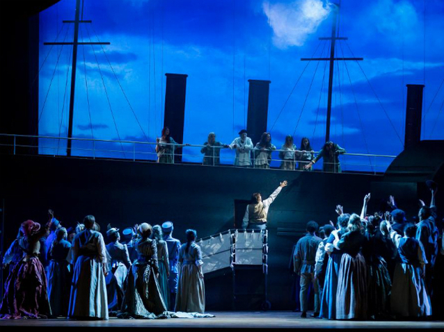 A ses atouts proprement musicaux s’ajoute l’efficacité d’une mise en scène (signée par le maître des lieux, Stefano Mazzonis di Pralafera) qui, tout en rendant hommage aux fêtes galantes (magnifique appartement d’apparat au II) sait aussi, au moment venu, faire preuve d’austérité (désert de sable rouge au IV). On passe ainsi d’un premier et deuxième tableaux très animés (la scénographie est signée par Jean-Guy Lecat) à un dernier acte d’un dépouillement qui annonce déjà la mort. Mais il faut également évoquer le superbe paquebot qui amène le malheureux vers les Amériques au III, image qui imprime fortement la rétine (photo). Bref, Mazzonis joue une fois de plus la carte de l’efficacité dramatique et de la lisibilité, et des frondaisons d’Amiens au désert de la Nouvelle-Orléans, le triste destin de Manon n'en trouve pas moins là les couleurs les plus justes.
