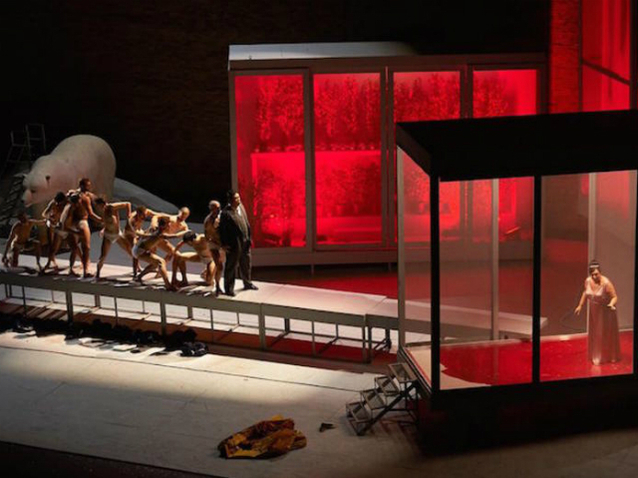 Nous avouerons n’avoir pas été vraiment emballé non plus par la proposition scénique confiée à Stefano Ricci, qui écarte ici toute référence à la Chine millénaire pour aborder l’ouvrage sous un angle psychanalytique : Turandot est ici une femme de notre temps qui a peur de grandir et se réfugie donc dans un monde de rêves et de chimères. De grandes vitrines lui servent d’espace mental, et accueillent ses peurs les plus profondes. Ainsi, après la résolution de la dernière énigme, on la voit patauger dans une énorme flaque de sang qui tapisse le fond d’une de ces boîtes vitrées (photo) : il faut y voir le sang qui sera généré par le premier rapport charnel, et donc l’humanité naissante de la princesse de glace. Sans être aussi gore (et gratuite), la mise en scène de l’homme de théâtre italien trouve ainsi quelque parenté avec celle de Calixto Bieito vue au Capitole de Toulouse il y a deux ans. Enfin, inutile de rechercher dans la direction musicale de Pier Giorgio Morandi la finesse et la transparence. A la tête de l'excellent Orchestre Philharmonique des Marches, le chef italien exalte au contraire les dissonances, le fracas des cuivres, bref les aspects les plus grandioses de la partition… pour le plus grand bonheur des spectateurs.