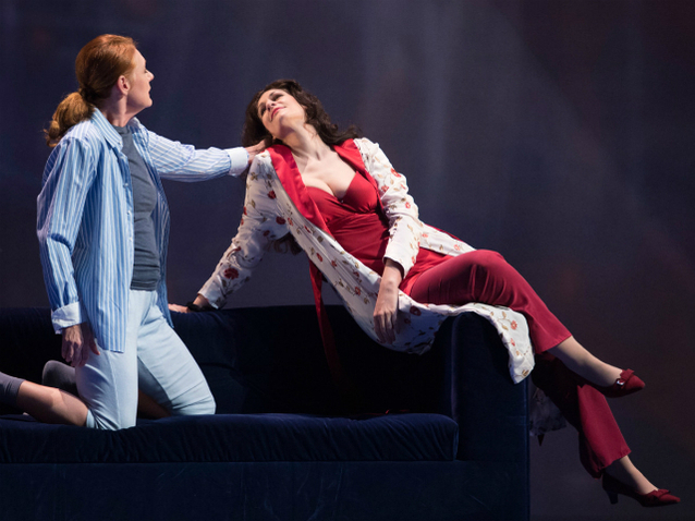 Octavian de légende, l'allemande Brigitte Fassbaender – qui n'en est pas à un coup d'essai avec déjà plus de soixante-dix productions lyriques à son actif – transpose l'action de nos jours même si, de manière décalée et surprenante (par nostalgie ?), les principaux protagonistes apparaissent par intermittence avec des costumes typiquement ancrés au XVIIIe. La scénographie conçue par Erich Wonder s'avère plutôt sommaire : quelques rares éléments de décor (le lit du I est remplacé par un large canapé) et l'utilisation d'immenses toiles peintes translucides suggérant différents espaces (un appartement design, une salle de spectacle, une usine désaffectée, etc.). C'est cependant surtout pour sa direction d'acteurs, sensible et fouillée, que l'on saluera le travail de l'ancienne mezzo retirée de la scène depuis vingt ans déjà.