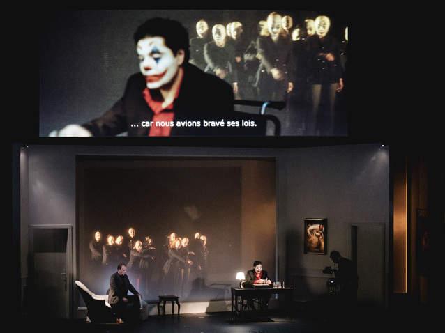 Pour cette nouvelle production de Samson et Dalila de Camille Saint-Saëns, Marie-Eve Signeyrole reprend les recettes qui avaient fait le « succès » de son Nabucco lillois il y a deux saisons, c’est-à-dire une recontextualisation moderne et politique du livret et un usage de tous les instants de la vidéo. Samson (en fauteuil roulant et grimé façon Joker) est ici le chef des Insurgés, en butte contre le Parti Conservateur dont Dagon est le chef corrompu. Nous sommes en pleine période électorale (on ne peut pas s’empêcher de penser à certaines échéances bien actuelles…), et dans cette lutte pour le pouvoir, Dalila est la directrice de campagne de Dagon, tandis que le Grand-Prêtre fait office de principal conseiller politique d’un parti prêt à tout pour arriver à ses fins. Selon un procédé de plus en plus récurrent, une équipe de vidéastes filme en permanence l’action scénique qui est projetée en live sur un écran géant qui s’étire sur toute la largeur haute du plateau (photo). A l’image du Nabucco précité, l’on est à la fois séduit par la virtuosité du procédé (et par la brillante direction d’acteurs), mais c’est souvent au détriment du chant et de la musique qu’elle s’exerce, car l’attention est sans cesse accaparée par ces images, en plus d’un plateau scénique aussi tournant que virevoltant… ce qui est un comble pour un ouvrage habituellement considéré comme trop statique ! Quant à la dimension religieuse, pourtant essentielle dans le livret, elle est tout simplement balayée ici, remplacée par une unilatérale composante politique, éludant ainsi le véritable sujet du drame biblique…