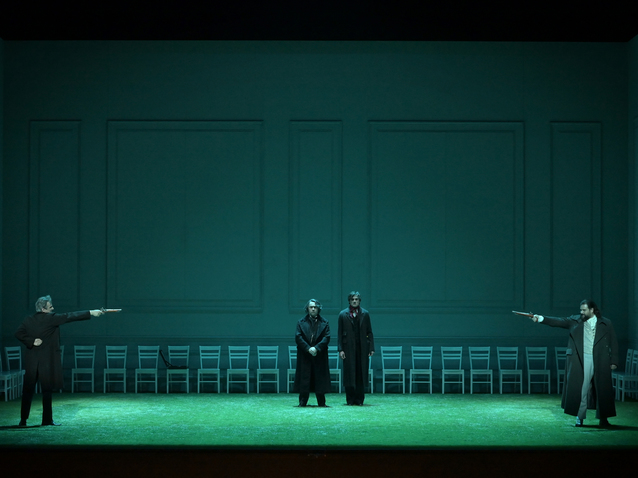 Eugène Onéguine est adapté de l’œuvre poétique de Pouchkine, à la fois dépourvue d’action et articulée autour de personnages ordinaires et désœuvrés, aux antipodes des héros épiques de l’opéra d’alors. Tchaikovski insuffle néanmoins une puissante théâtralité à son ouvrage, portée par l’agitation intérieure de ses personnages. Et c’est sans doute là qu’échoue la mise en scène de Stéphane Braunschweig. On pourrait dire par un euphémisme (de bon ton aux pots de première) qu’elle est « minimaliste ». Pour parler franchement, elle est incroyablement paresseuse et s’assume complètement comme telle. Le patron de l’Odéon - Théâtre de l’Europe n’est pas tout à fait étranger au monde du théâtre, et pourtant « ses » personnages ne sont que des chanteurs bloqués dans leur carcasse de citoyen, sans une once de direction d’acteur. Rien n’existe sur la scène, ni les sentiments ni la vérité (ni même l’illusion, d’ailleurs). Avec la carrière qu’il possède, on pourrait attendre autre chose que des dispositions de chaises, pour ne citer que la partie la plus pertinente à analyser. Le reste n’est que du temps, sans début ni fin, un mauvais moment à passer non pas parce que ce qu’on voit est dérangeant, choquant ou pénible, mais parce que les tours de cadran sont les seules unités qui puissent le quantifier ou le décrire. Le finale entre Tatiana et Onéguine s’avère aussi insignifiant que leur rencontre ou que l’air de la lettre. Le Chœur de l’Opéra National de Bordeaux – la maison girondine est coproductrice –, de tenue correcte, est embrigadé dans des chorégraphies loin d’être déshonorantes, mais vaines. La lecture n‘existe pas, il s’agit de non-scènes dans une non-dramaturgie.
