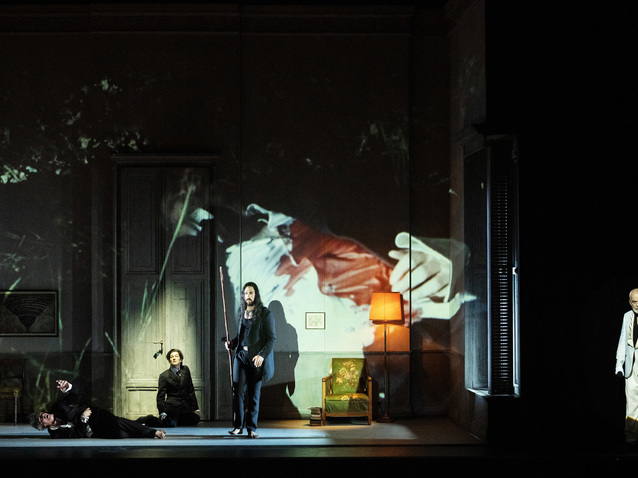 La mise en scène, acceptable, est cependant à mille lieues du Claus Guth des grands soirs. La surutilisation de la vidéo – un accident de voiture, l’errance dans les bois – dans des séquences lourdes et répétitives ne fait pas que du bien à l’espace, par ailleurs magnifiquement éclairé par Fabrice Kebour. Si le volume se révèle au fur et à mesure des sept parties, le mouvement a du mal à trouver une complémentarité avec la fosse, et la dimension visuelle sauve parfois des chorégraphies pénibles et un concept qui tourne en rond. Claus Guth nous refait le coup des intérieurs bourgeois, du décor de salle des fêtes et du slow motion ; nous ne le sentons guère pénétré par le sujet de la traversée, à part dans quelques scènes, comme quand l’aimée de Dante marche sur un drap noir qui essaie de l’ensevelir, ou quand un flux continu de fantômes avance inlassablement de jardin à cour vers une source de lumière invisible.